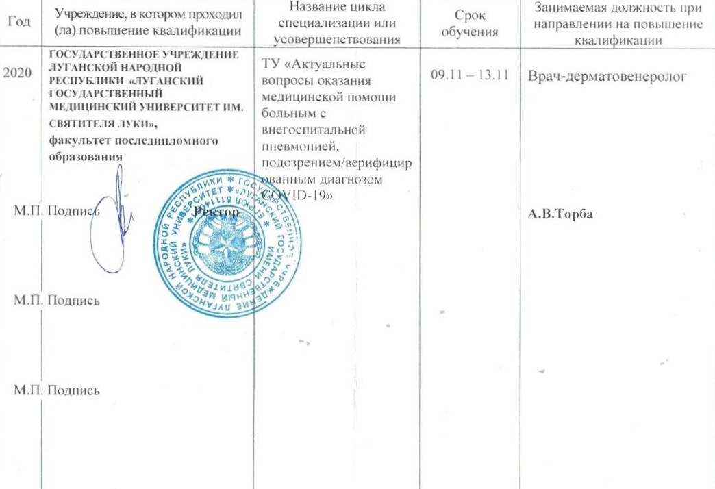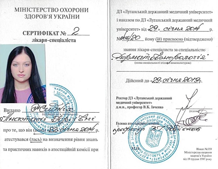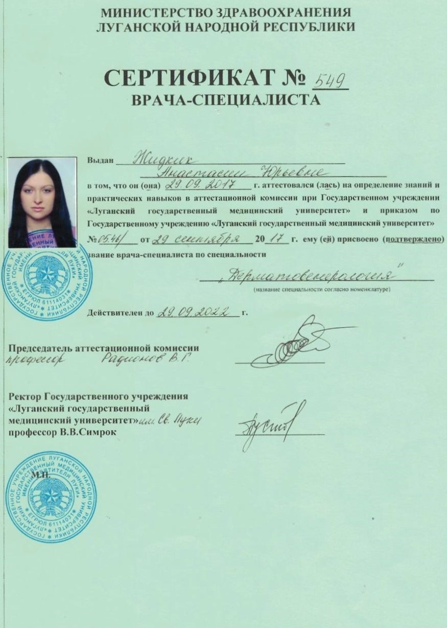 Веду приём пациентов по направлениям: дерматолог взрослый, дерматолог детский, косметолог, трихолог, венеролог. В своей практике применяю современный подход к диагностике и лечению моих пациентов. Для диагностики кожных заболеваний использую дерматоскоп.